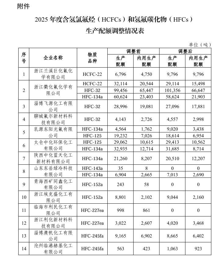 14家氟化工企業將調整2025年度HCFCs和HFCs生產配額