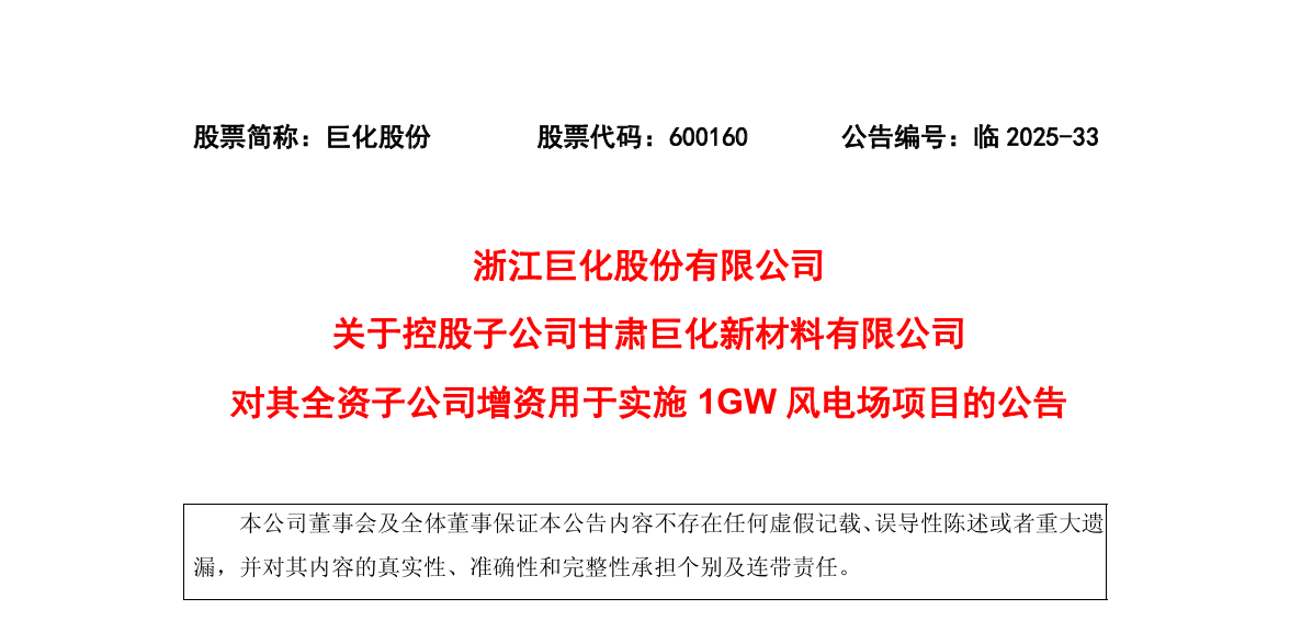 6月20日,巨化股份發布公告,其控股子公司甘肅巨化通過現金出資8億元,對全資子公司巨化新能源進行增資,將其注冊資本從5000萬元提升至8.5億元。此次增資旨在滿足巨化新能源實施1GW風電場項目的資本金需求。