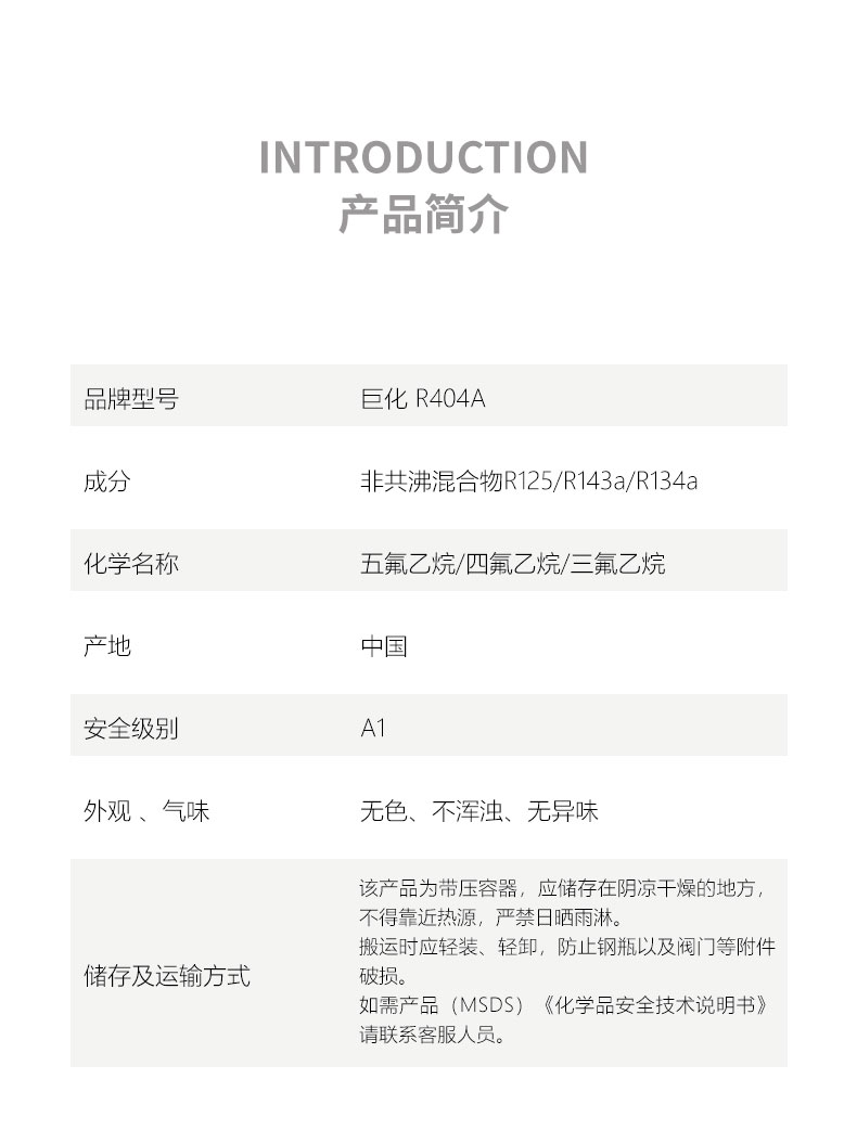 R-404A制冷劑,別名R404A,商品名稱有SUVA HP62、SUVA 404A、Genetron 404A等。由于R-404A屬于HFC型非共沸環(huán)保制冷劑(完全不含破壞臭氧層的CFC、HCFC),得到目前絕大多數(shù)國家的認(rèn)可并推薦的低溫環(huán)保制冷劑,廣泛用于新冷凍設(shè)備上的初裝和維修過程中的再添加。符合美國環(huán)保組織EPA、SNAP和UL的標(biāo)準(zhǔn),符合美國采暖、制冷空調(diào)工程師協(xié)會(ASHRAE)的A1安全等級類別(對人身體無害)。