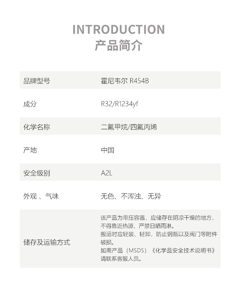 品牌型號:品牌型號:Honywell Solstice? R454B 產 地:中國 化學成分:R1234yf/R32 分 類:混合物 安全級別:A2L(無毒不可燃) 純 度:≥99.98% 包裝規格:9.75kg